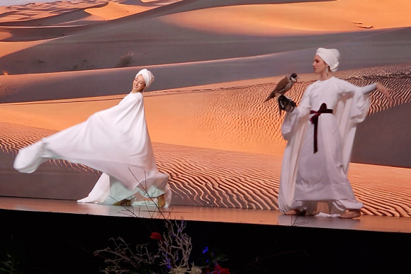 In der opulenten Umgebung des großen Ballsaales gab es ein aufwändiges Bühnenprogramm, eingeleitet von 3 bezaubernden Tänzerinnen in weiten weißen Roben, die in der Bewegung wie Flügel aussahen und von zwei lebenden (!) Falken begleitet wurden. In der anschließenden Ansprache betonte der Botschafter die engen wirtschaftlichen, politischen und kulturellen Bindungen zwischen Katar und Deutschland. Insbesondere der Status erfolgreicher Mediation in den Verhandlungen bei weltweiten Krisen hat Katar internationalen Respekt eingebracht. Speziell Doha ist für seine futuristische Architektur neben antiken islamischen Bauten bekannt. Trotz hochmoderner Infrastruktur hat es nichts von der glamourösen Glitzerwelt anderer arabischer Großstädte. Katar ist eine zunehmend attraktive Destination im weltweiten Tourismus. Auffallend ist der überaus respektvolle Umgang Frauen gegenüber. Eine eindrucksvolle Modenschau von 2 Designerinnen umrahmte das Programm und natürlich durften die arabischen Delikatessen nicht fehlen. Im Vorraum des Ballsaales gab es außerdem kostbare Schmuckstücke der Juwelierkunst zu bewundern.