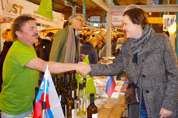 Die slowenische Botschafterin I.E. Dr. Ana Polak Petrič besuchte den Stand der Familie Butul und wurde von Mitja Butul begrüßt