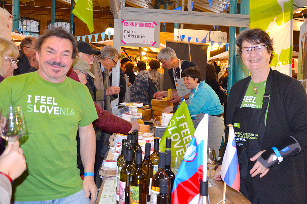 Neben ungewöhnlichen Käsesorten konnten Besucher hervorragende Weine, Brot, exotische Marmeladen und Brotaufstriche verkosten, sowie Granatapfel-Essig, Bergamotte-Öl oder Sirup aus Feigenblättern. Alle Produkte des Bio-Hofes, der im Dorf Manžan in der Nähe von Koper im slowenischen Istrien liegt, sind zu 100 % in Bio-Qualität, völlig ohne chemische Zusätze. Auch unzählige Kräuter gedeihen in diesem Mittelmeer-Klima gut, exotische Kräutermischungen dürfen in den zahlreichen Gerichten, die die Familie für Urlauber zubereitet, nicht fehlen. Das Ehepaar Tatjana und Mitja Butul und der erwachsene Sohn Domačija bieten neben ihren selbst hergestellten Bio-Produkten auch Übernachtungsmöglichkeiten für Touristen an. Mit der Kombination aus Bio-Gastronomie, Tourismus und Farming liegt der Familienbetrieb offenbar voll im Trend, das Interesse am slowenischen Stand war den ganzen Nachmittag über ungebrochen.