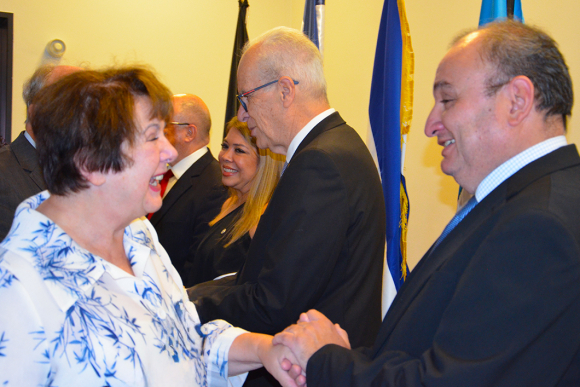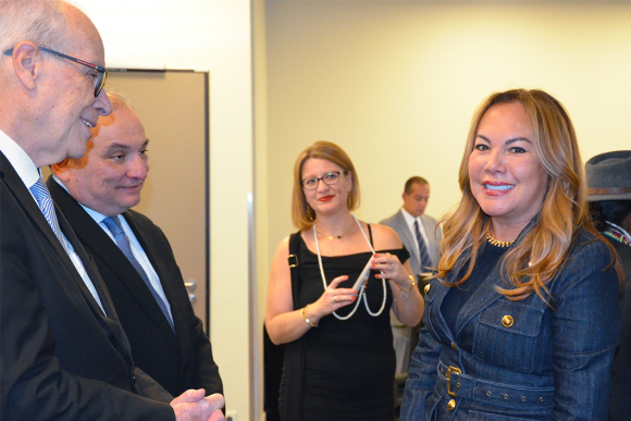 Dr. Irene Ernst, CEO Diplomatisches Magazin und S.E. Mauricio Arturo Bueso, Botschafter von Honduras begrüßen sich; im Hintergrund die Botschafterin von El Salvador und der Botschafter von Guatemala