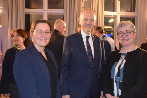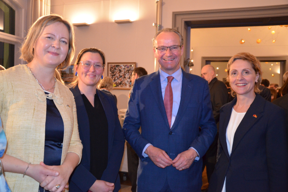v.li.: I.E. Adriana-Loreta Stănescu, Botschafterin Rumäniens (im Hintergrund); Anne Kathrin Kirsch, stv. Büroleiterin bei Staatsminister Krichbaum; S.E. Giedrius Puodziunas, Botschafter von Litauen; I.E. Maeve Monica Collins, Botschafterin von Irland