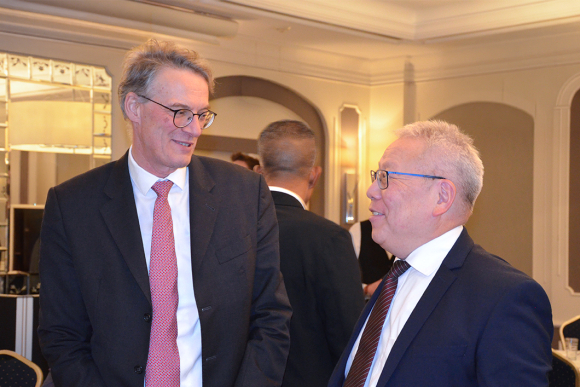 S.E. Dr. Joachim Bertele ging in seinem Grußwort auf die gemeinsamen Werte und Überzeugungen ein und bekräftigte die Notwendigkeit des klimagerechten Wirtschaftens. Die Malediven seien in besonderer Weise den Bedrohungen des Klimawandels ausgesetzt, 80 % des Territoriums der Malediven liege weniger als einen Meter über dem Meeresspiegel. Er dankte für die Einladung zum Jubiläum und dem Präsidenten der Malediven: „Wir schätzen es sehr, dass Sie in dieser kritischen Phase der globalen Politik weiterhin den aktiven Austausch mit Deutschland und Europa suchen.“